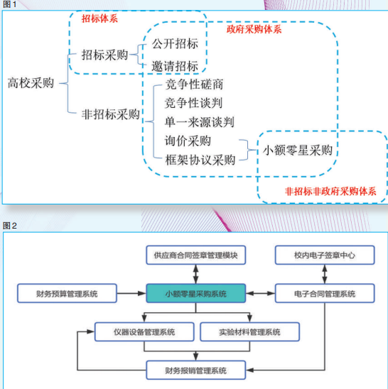 高校作为公益二类事业单位执行政府采购,所采购的项目多为教学科研设备、设施、实验材料以及与教学科研相关的工程和服务,根据其自身特性,几乎囊括了招标投标法以及政府采购法所有的采购方式,小额零星采购属于非招标采购,包括政府采购和非政府采购范畴,如图1所示。