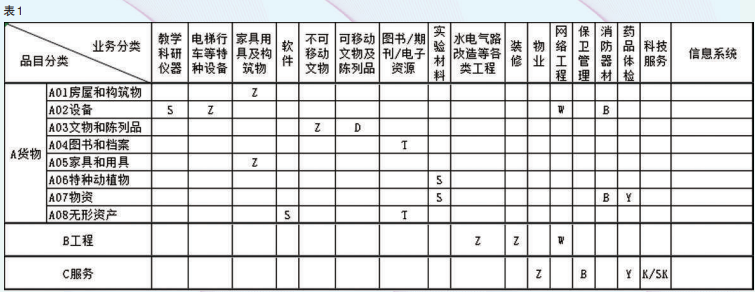 ——融合多系统,构建全生命周期采购管理平台。体系建设的首要任务是制度建设,以东南大学为例,学校于2024年2月修订了《东南大学经济合同管理办法(修订)》,进一步厘清、明确了各职能部门的分工和职责,实验室与设备管理处(S)负责学校仪器设备、软件、实验材料(含化学品)、其他货物(信息化、安防、后勤、体育等设备设施)、仪器设备维保、维护及软件升级、仪器设备租赁等;总务处(Z)负责建筑修缮、装修、改造、绿化与景观、水电气、道路等工程,监理、装修材料、各类家具、物业管理、搬运以及特种设备(电梯、锅炉、行车)及与之相关的维护维保等;科研院(K)负责理工医类科研项目中外协服务、技术(咨询)服务等;社会科学处(SK)负责社科类科研项目中外协服务、技术(含咨询)服务等;网络与信息中心(W)负责网络工程等;图书馆负责图书、期刊、电子资源等;档案馆(D)负责陈列品及可移动文物等;保卫处(B)负责安全保卫管理、校内交通、消防器材等;校医院(Y)负责药品、体检、检测等。结合《政府采购品目分类目录》以及《固定资产等资产基础分类与代码》,归纳如表1所示。