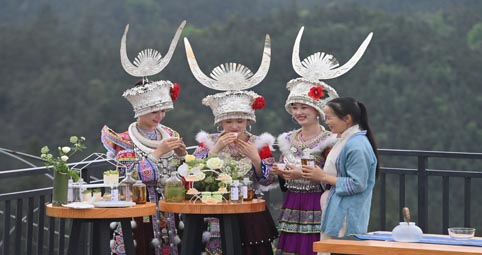 近日,广西壮族自治区融水苗族自治县举办粤桂协作大苗山踏青茶旅文化活动,茶商和游客欢聚苗乡,赏春色、品春茶、话产业发展。近年来,该县在结对帮扶的广东廉江市协作下,充分利用特色茶资源,投入粤桂协作帮扶资金,建设现代特色农业产业综合示范园区,发展茶文旅融合产业,助力乡村振兴。图为在融水苗族自治县水融香粤桂协作现代农业产业园,人们在茶山上品茶。